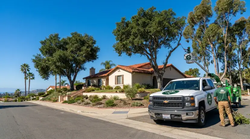 Tree trimming in Vista changes depending on which side of the 78 you're on. Inland lots near Twin Oaks Valley deal with dry-season wind sail on eucalyptus and pepper trees, while the Shadowridge tract homes mostly need jacaranda and palm cleanup before the rainy season makes a mess of driveways.